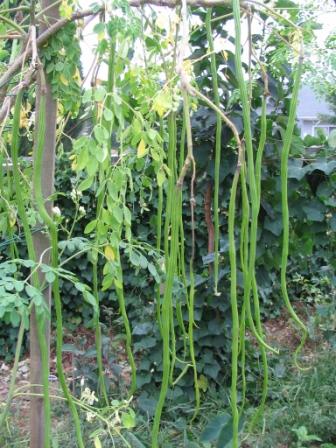 At home, we have eaten lots of Moringa pods from our own trees, and have to say that we like them best when they are young and tender. We eat them raw, right from the tree, or cook them just until they turn green, like string beans. Don't eat all of your pods, or you won't get any seeds!